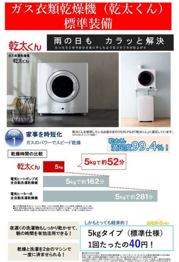 ガス衣類乾燥機(乾太くん)標準装備!