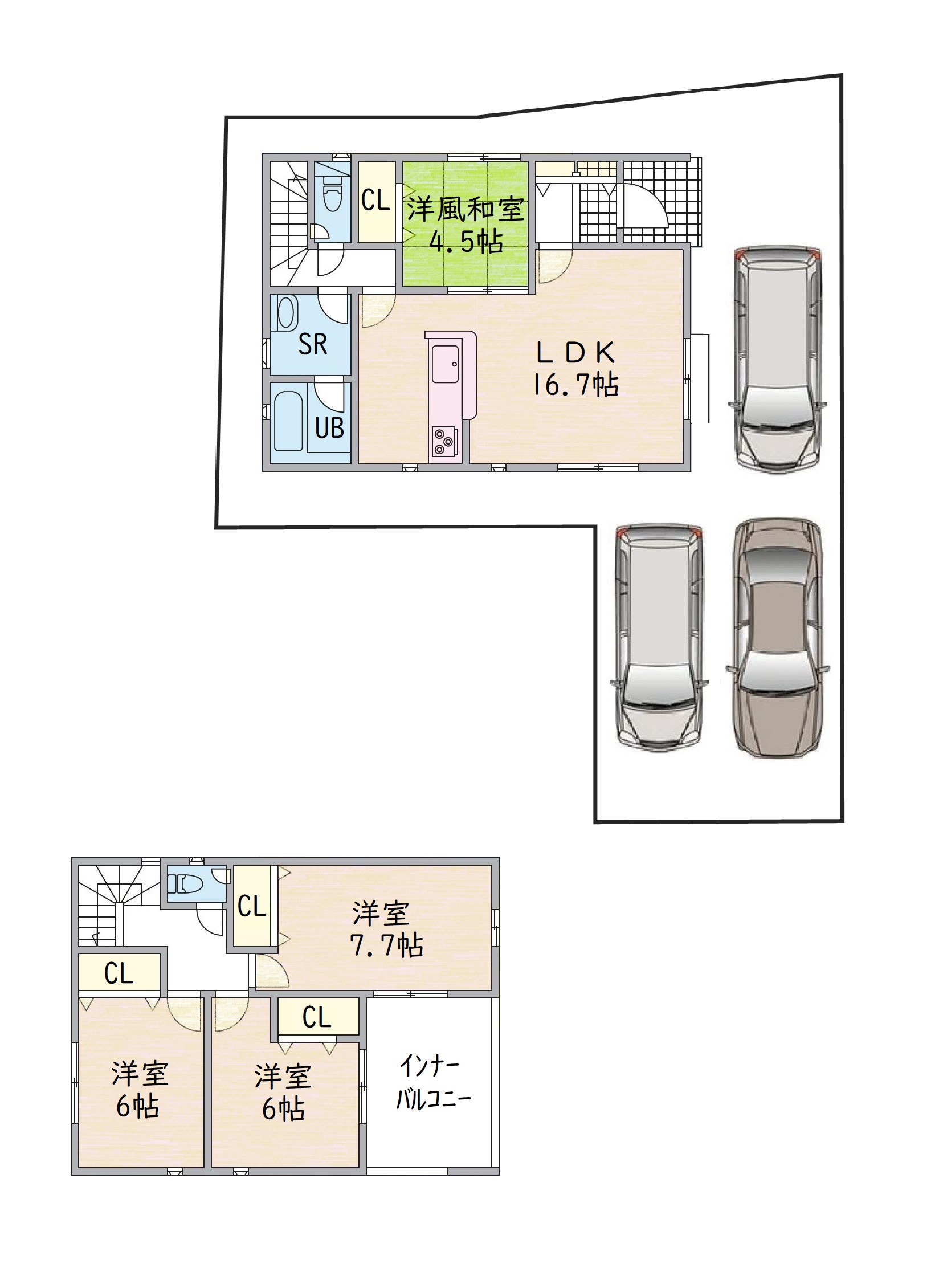 駐車2~3台可。自転車・バイクもゆったりとめられます。お庭スペースはガーデニングやお子様のプール遊びにも使えます♪(同社施工例)