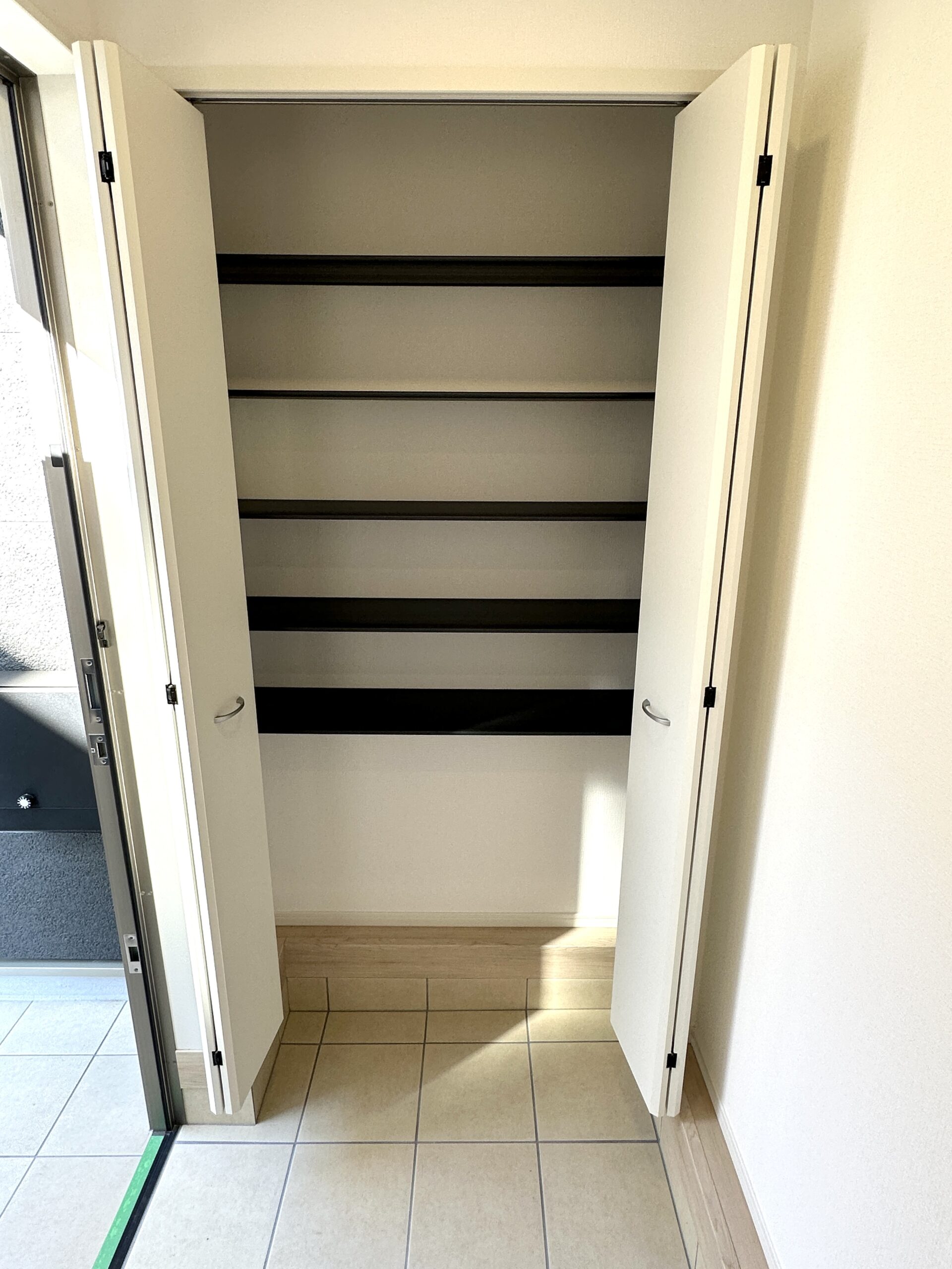 玄関を使いやすくスッキリ見せることのできるウォークインシューズクローク☆たくさん靴が収納でき、可動式の棚なのでベビーカー・アウトドア用品・スポーツ用品も収納出来ます♪(同社施工例)